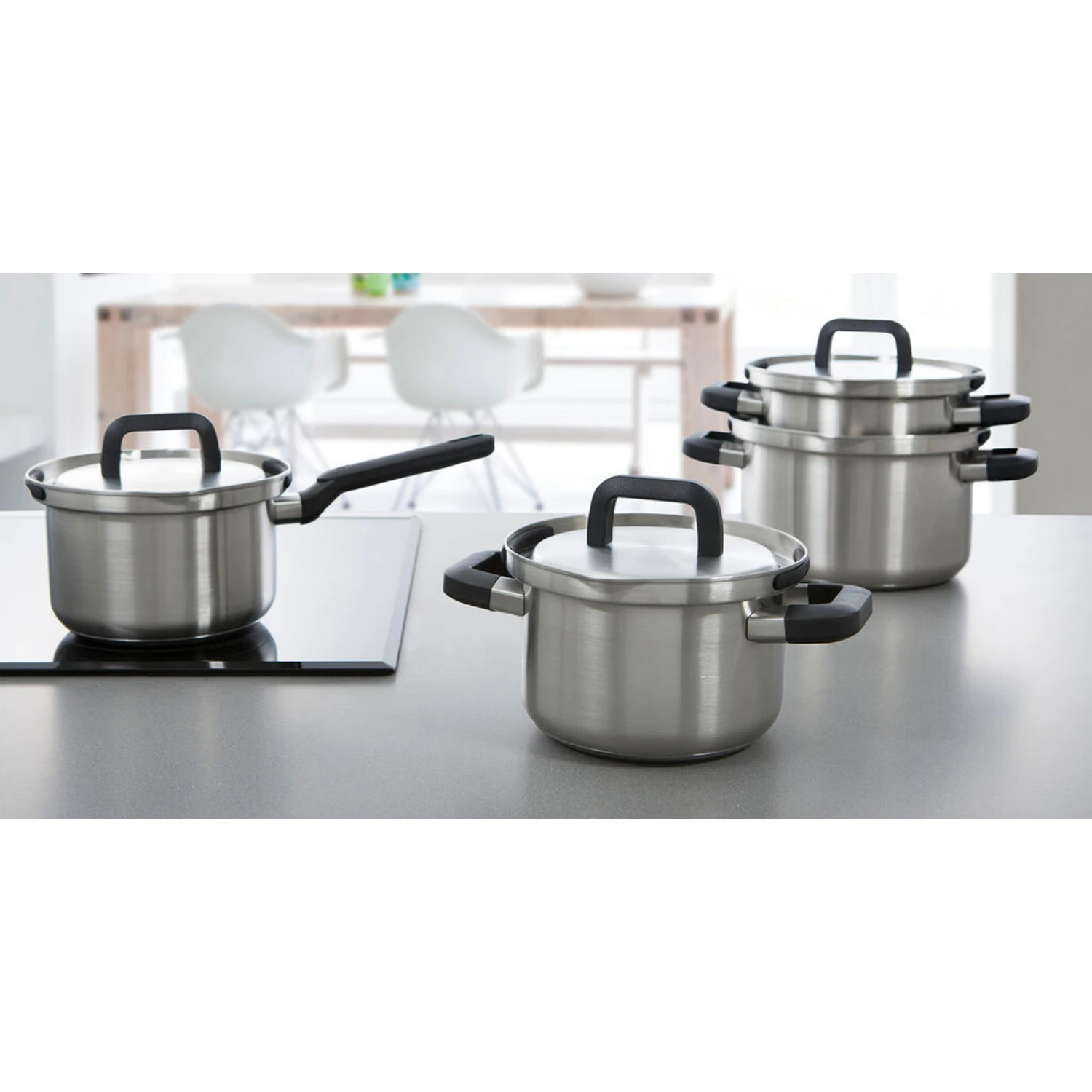 Een stoere rvs pannenset van BK. De BK Flow Cool pannenset is vier delig en bestaat uit 3 kookpannen met deksel en een steelpan met deksel. De BK Flow Cool kookpannen zijn voorzien van een veilig en uniek afgietsysteem. Met een simpele kwartslag draai, vergrendeld de deksel onder de zwarte siliconen stoppers. Zo kun je op een veilige manier met twee handen afgieten.Â