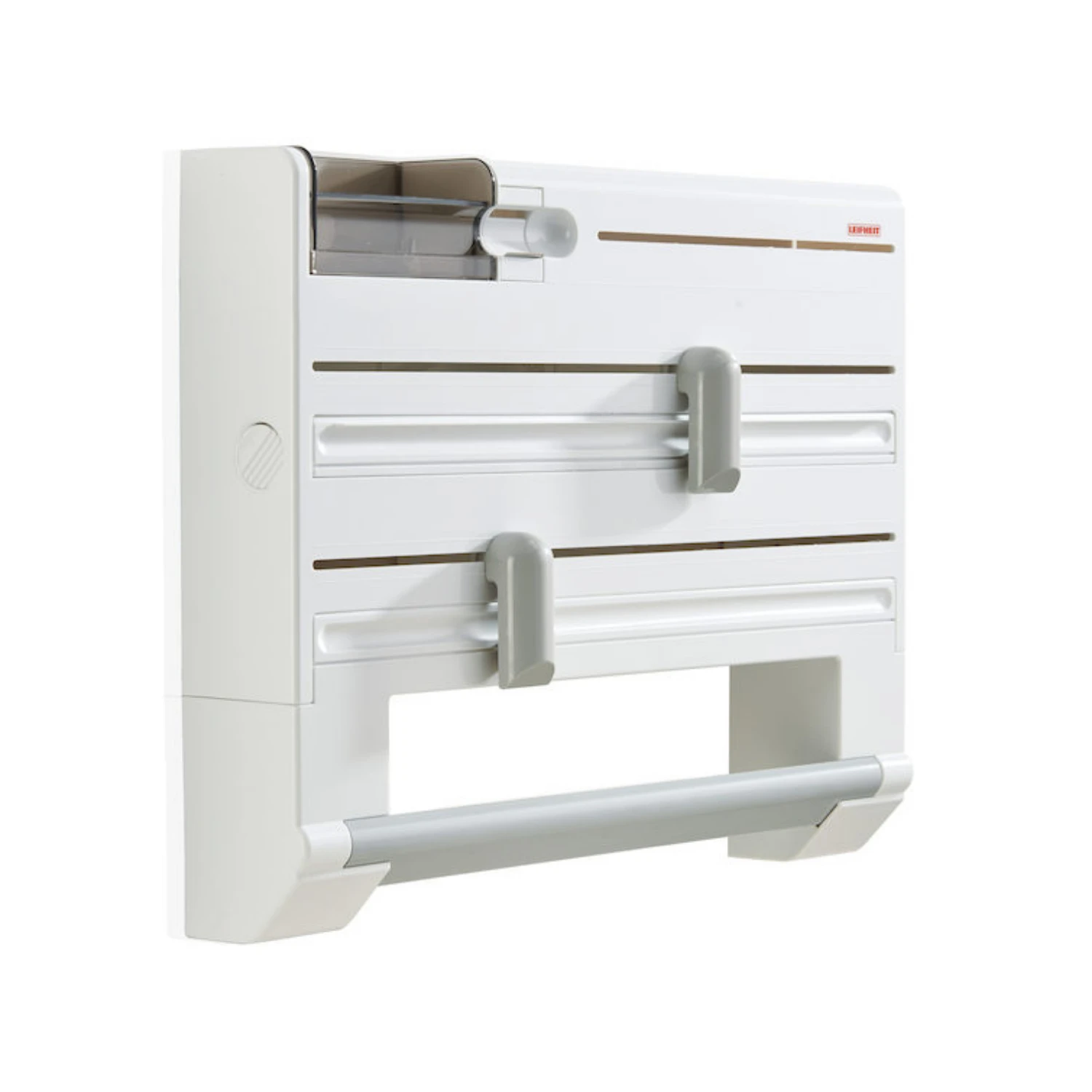Al je huishoudfolie bij elkaar met de Leifheit Parat Plus keukenrolhouder wandmodel. De rollenhouder biedt plaats tot wel vier rollen. Aluminiumfolie, keukenpapier, huishoudfolie en zelfs diepvrieszakjes zijn handig in een apparaat opgeborgen. De keukenrolhouder Parat Plus is voorzien van vlijmscherpe snijschuivers die zorgen voor het eenvoudig afsnijden van foliën. De vlijmscherpe messen zijn veilig achter de ergonomisch gevormde snijschuivers weggewerkt, waardoor de Leifheit keukenhulp zorgeloos in gebruik kan worden genomen.