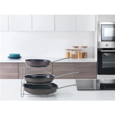 Met de braadpanhouder van Metaltex heb je altijd overzicht in je keukenkast. Plaats de houder in een keukenkast om je pannen gemakkelijk te stapelen en om krassen te vermijden. Of reserveer een plekje op het aanrecht voor de pannenhouder zodat je altijd overzicht hebt. De braadpanhouder heeft plek voor 4 pannen en is gemaakt van Polytherm.